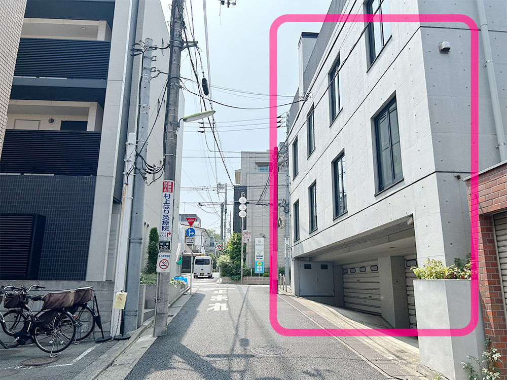 直進すると交差点手前、右側にコンクリートの建物がみえます。